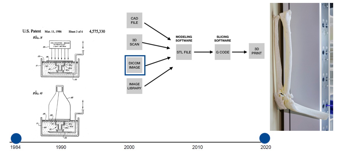 Fig.: Evolution of medical 3D-printing: on the left, Chuck Hall's original patent drawing from 1986; in the center, the process from image dataset to 3D-print; and on the right, a 3D-print of a CT dataset of a patient with complex (transolecranon) dislocation fracture of the right elbow.