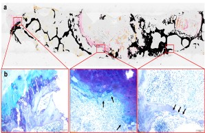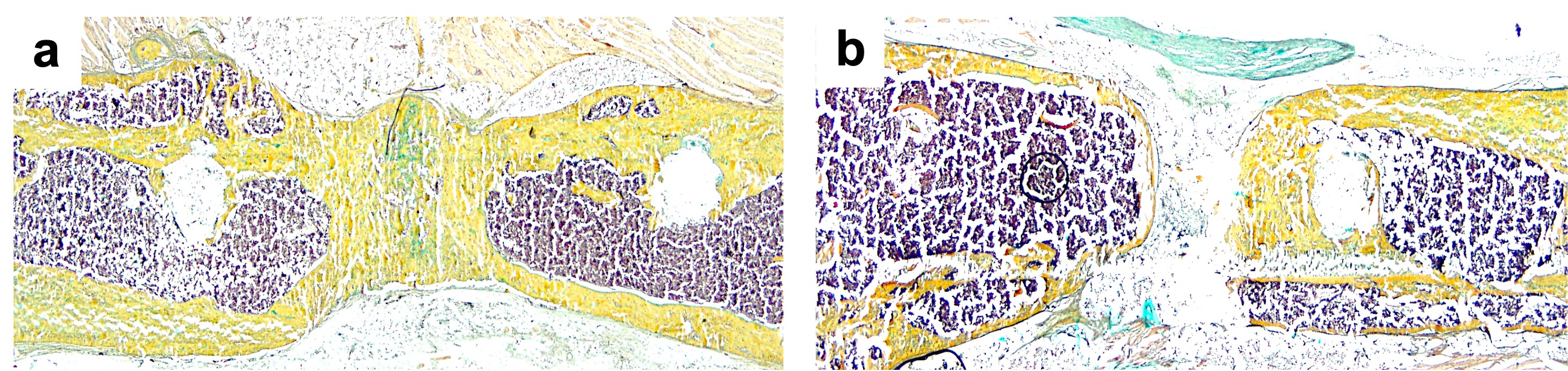 Fig.: Histological image (Movat pentachrome staining) of a healing (a) and a non-healing (b) long-bone fracture. Mineralized bone appears yellow.