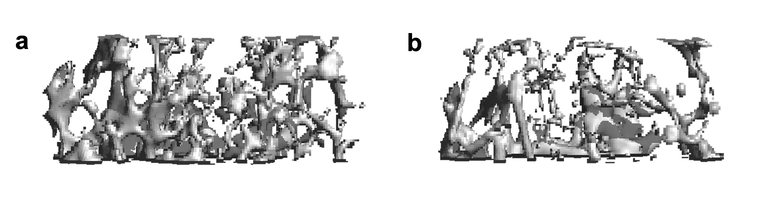 Fig.: Radiological imaging (µCT) of altered bone structure in systemic bone loss disorders. (a) Normal trabecular bone architecture. (b) Rarified and thinned trabecular structure in post-menopausal osteoporosis.