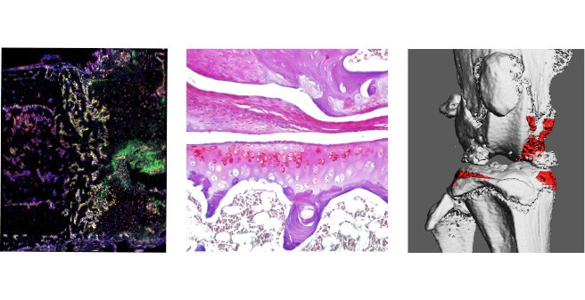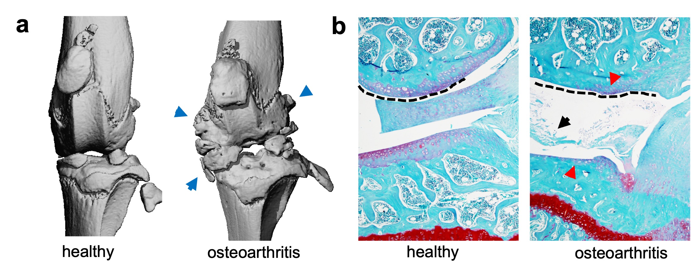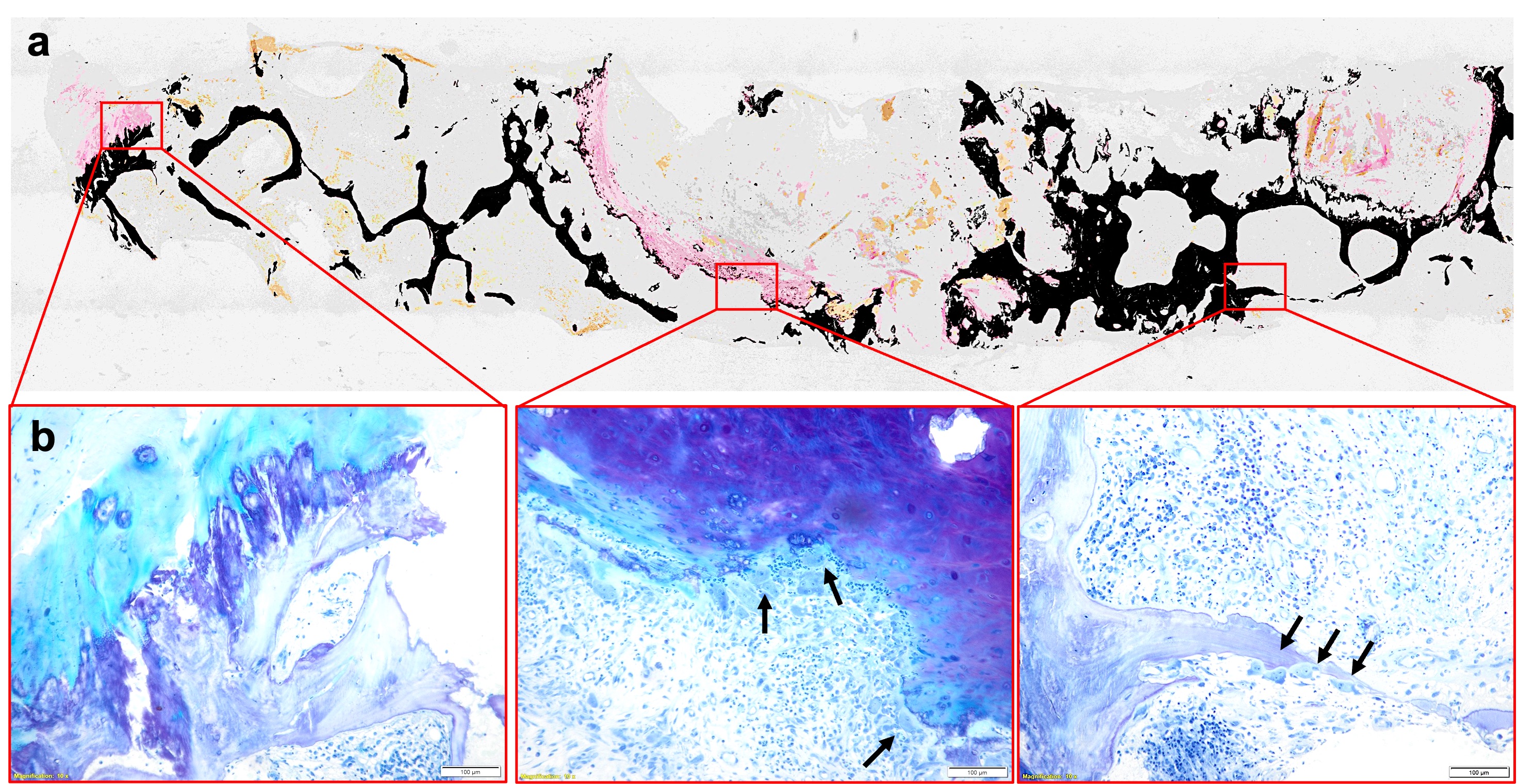 Fig.: Radiological (µCT; a) and histological (b) imaging of joint changes in post-traumatic osteoarthritis. The classic signs of osteoarthritis appear with osteophytes (blue arrows), meniscal degeneration (black arrow), joint deformation (dashed line), and loss of articular cartilage (red arrows).