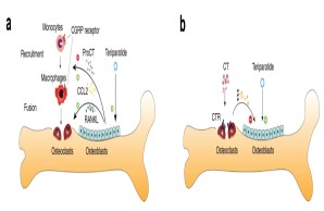 Fig.: Interaction of bone cells with immune cells after osteoanabolic teriparatide therapy. (a) Teriparatide induces procalcitonin (ProCT) expression in osteoblasts, which impairs the recruitment of osteoclast precursors (i.e., monocytes and macrophages) to the bone surface, thereby inhibiting bone resorption. (b) Circulating calcitonin (CT) impairs the osteoanabolic effect of iPTH based on tonic inhibition of bone formation, presumably via osteoclasts. Modified from Baranowsky et al, Bone Research 2022.