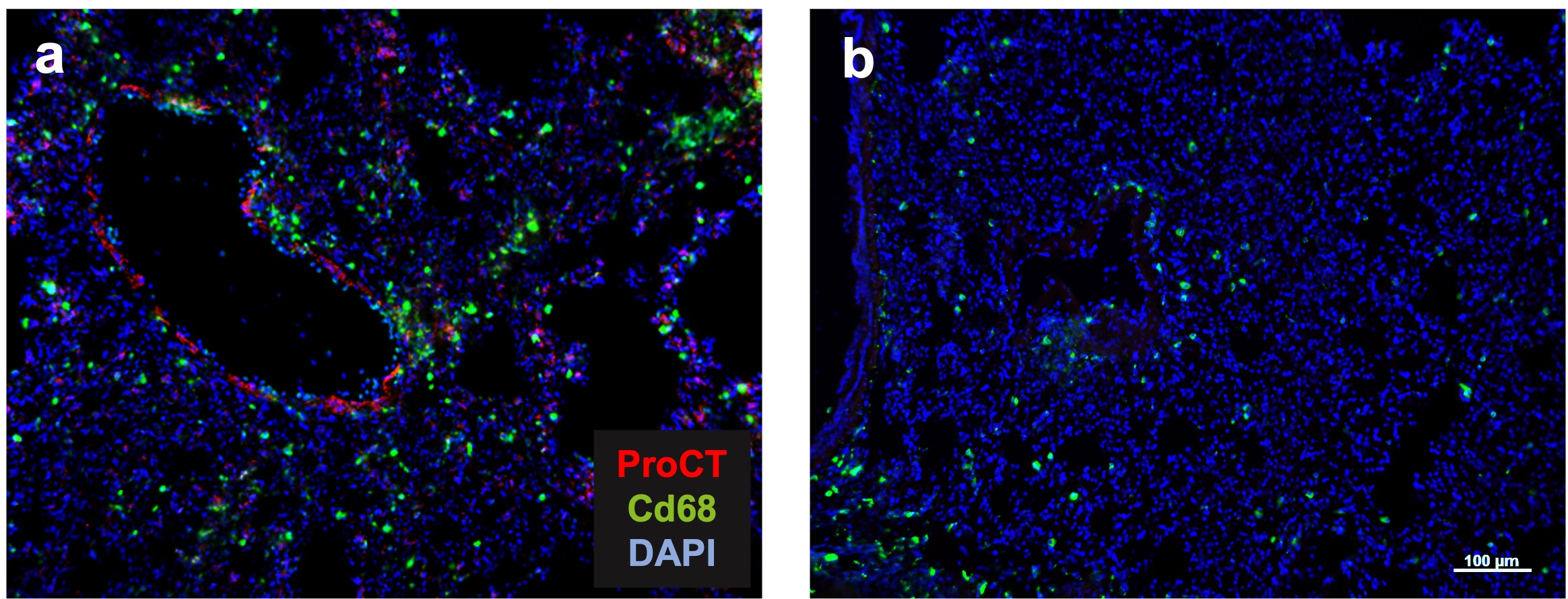 Fig.: The role of procalcitonin in post-traumatic sepsis. The sepsis biomarker procalcitonin (ProCT) is not only used to diagnose bacterial sepsis, but also functions as a pathophysiological mediator in this disease. ProCT enhances the generalized inflammatory response in sepsis, leading to tissue injury, shown here in immunofluorescence of macrophages (Cd68) in lung preparations (a). If procalcitonin is blocked during sepsis, the inflammatory response and tissue damage are much less pronounced (b). Modified from Baranowsky et al, Critical Care Medicine 2021.