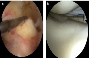 Fig.: Internal knee trauma as a typical example of common musculoskeletal injuries. (a) Fresh tear of the anterior cruciate ligament (ACL). Here, the ACL is pulled forward with a hook probe during arthroscopic exploration. (b) Arthroscopic suture of a torn meniscus in the posteromedial joint corner.