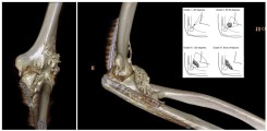 Fig.: 3D-rendered CT of the left elbow in a 25-year-old male with complex trauma to the elbow. Post-traumatically, a massive heterotopic ossification (HO) is formed ventrally and radially in the soft tissues. In the insert, a schematic drawing explaining the classification of HO at the elbow according to Ilahi.