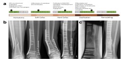 Fig.: Fracture healing. (a) Course of regular fracture healing and growth hormones involved. (b) Case report with delayed fracture healing and peri-implant fracture. (c) Healing after multistage therapy using Masquelet technique and bone graft with autologous cancellous bone. Modified after Schlickewei, Kleinertz et al., IJMS 2019.