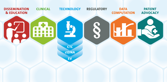 The technology working groups are subdivided according to their focus. Currently 3 WGs exist spanning the CTC, ctDNA, and EV fields. The overarching goal of these groups is to identify optimally suited assays for specific scientific and clinical questions and to work towards optimization, harmonization and standardization of these methods.